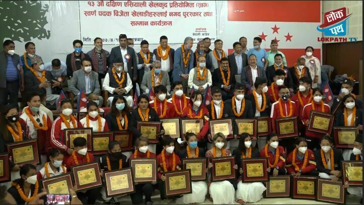 काठमाडौं । १३ औं दक्षिण एशियाली खेलकुद सागमा स्वर्ण पदक जित्ने खेलाडीहरुलाई नेपाली कांग्रेसले सम्मान गरेको छ ।