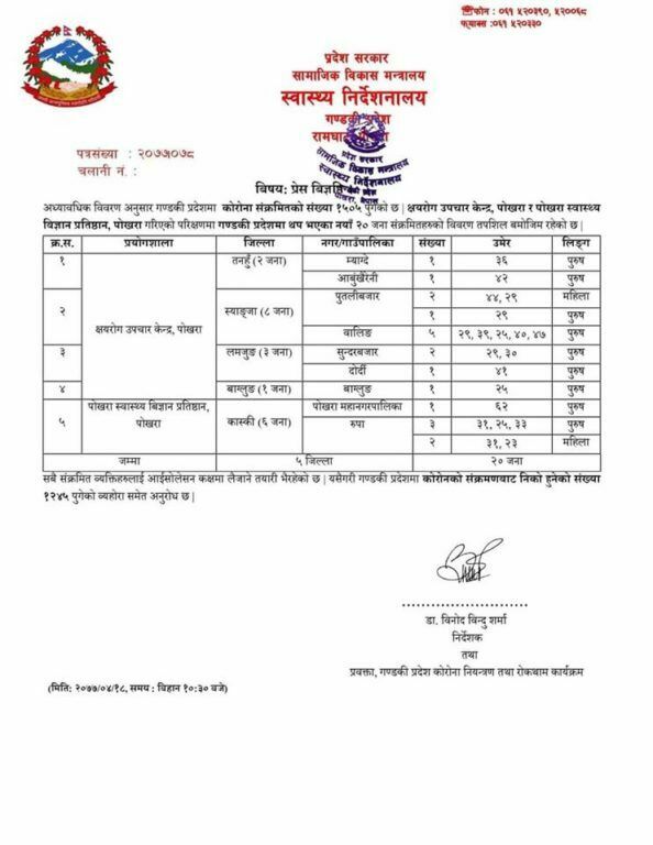 काठमाडौं । गण्डकी प्रदेशका ५ जिल्लामा आज थप २० जनामा कोरोना संक्रमण पुष्टि भएको छ । यससँगै गण्डकी प्रदेशमा कोरोना संक्रमितको संख्या १ हजार ५ सय ५ पुगेको छ ।