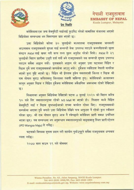 सुरक्षा गार्ड सम्बन्धी सेवा उपलब्ध गराउँने कम्पनीहरुको छाता संगठन पिआइकेएमको मार्फत दूतावासले उक्त घटनाको बारेमा जानकारी उपलब्ध गराएको थियो । पिआइकेएमले जुलाई ३१ म प्रहरीमा उजुरी दिएको थियो । साथै दूतवासले उक्त घटनाको बारेमा थप जानकारी गराउनको लागि सबैलाई आग्रह गरेको थियो । दूतवासको आह्वान अनुसार उनीहरु दुवै ना उपस्थित भएका थिए । मलेसियाको अध्यागमन कानूनका अनुसार पिडक र पीडित दुबै मलेसियाको अवैधानिक अवस्थामा रहेको पुष्टि भएको छ ।