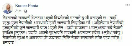 लेबनानको राजधानी बेरूतमा भएको विष्फोटको घटनाले दु:खी बनाएको छ । त्यहाँ रहनुभएका नेपालीको अवस्थाबारे हामी जानकारी लिइरहेका छौँ । अहिलेसम्म नेपालीको हताहतीबारे कुनै जानकारी प्राप्त भएको छैन । हाम्रो सम्पर्कमा आउनुभएका सबै नेपाली सुरक्षित हुनुहुन्छ । यद्यपि, आफ्नो सुरक्षाप्रति सावधानी अपनाउन सबैमा अनुरोध गर्दछु । नेपालीको सुरक्षा र आवश्यक परे उद्धारका निम्ति नेपाल सरकारले समेत पहल गरोस् ।