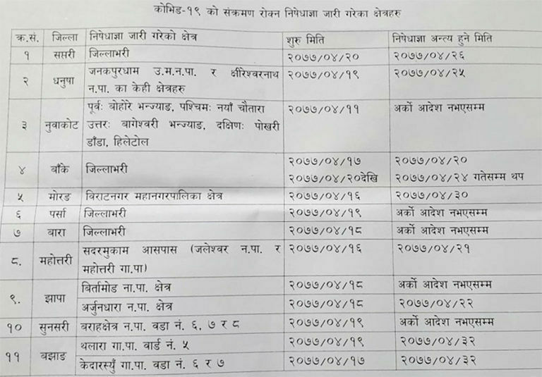 कोरोना जोखिम न्यूनिकरणको लागि सप्तरी, धनुषा, नुवाकोट, बाँके, मोरङ, पर्सा, बारा, महोत्तरी, झापा, सुनसरी, बझाङ, दार्चुला, सर्लाही र स्याङ्जा जिल्लाका विभिन्न क्षेत्रमा निषेधाज्ञा जारी गरिएको गृह मन्त्रालयले जनाएको छ ।