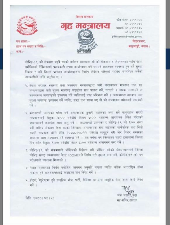 काठमाडौं । कोरोना भाइरस कोभिड १९ को संक्रमण बढ्दै गएको अवस्थामा यसको रोकथाम र नियन्त्रणको लागि प्रभावकारी कार्यान्वयनसहित गृह मन्त्रालयले विशेष निर्देशन जारी गरेको छ ।
