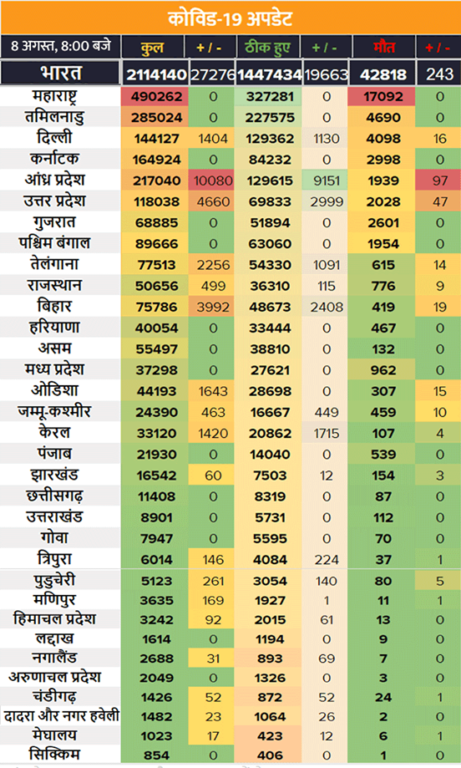 यसैगरी केन्द्रीय स्वास्थ्य मन्त्रालयका अनुसार देशमा कोरोना निको हुनेको संख्या कूल ४ लाख नाघेको छ । मन्त्रालयले निको हुनेको संख्यामा लगातार सुधार भएको भन्दै शनिबार सम्म कुल संक्रमितमध्ये ६८.३२ प्रतिशत पुगेको जनाएको छ । यस्तै मृत्यु दर २.०४ प्रतिशत रहेको छ । इन्डियन काउन्सिल अफ मेडिकल रिसर्चका अनुसार शुक्रबार ५ लाख ९८ हजार ७७८ जनाको कोरोना टेस्ट भएको थियो । योसँगै देशभर २ करोड ३३ लाख ८७ हजार १७१ स्याम्पल परीक्षण सम्पन्न भएको छ ।