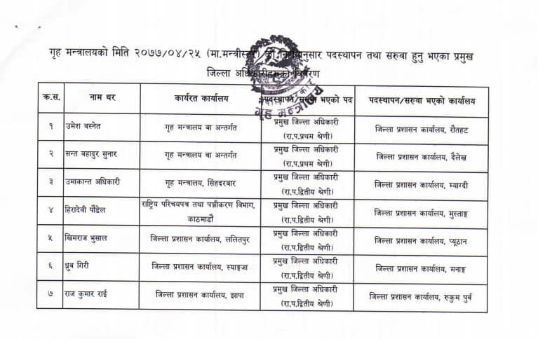 जसअनुसार मुस्ताङको प्रजिअमा हिरादेवी पौडेल, प्यूठानमा खिमराज भुसाललाई सरुवा गरिएको छ । भने गृहमन्त्रालयका सह–प्रवक्ता उमाकान्त अधिकारीलाई म्याग्दी सरुवा गरिएको छ ।