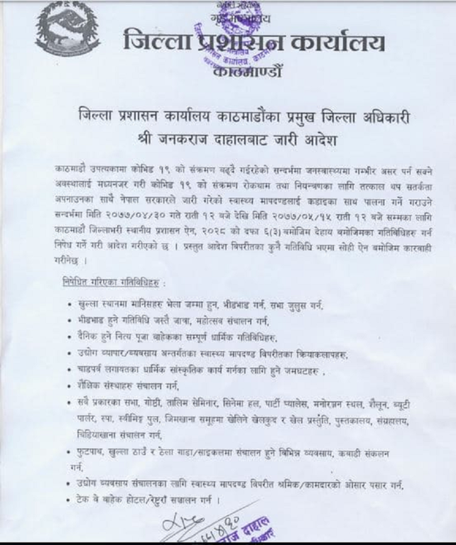 काठमाडौं । कोरोना संक्रमणको जोखिम बढेसँगै जिल्ला प्रशासन कार्यलय काठमाडौंले उपत्यकामा नयाँ नियम लागू गर्दै विभिन्न क्रियाकलापमा रोक लगाएको छ ।