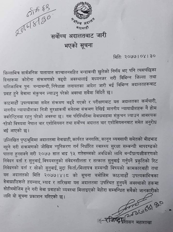 सर्वोच्चले शुक्रवार एक विज्ञप्ति जारी गर्दै आगमी भदौ १५ गतेसम्मका लागि विभिन्न अदालतबाट प्रवाह हुने सेवामा संकुचन ल्याउन निर्णय गरेको हो ।