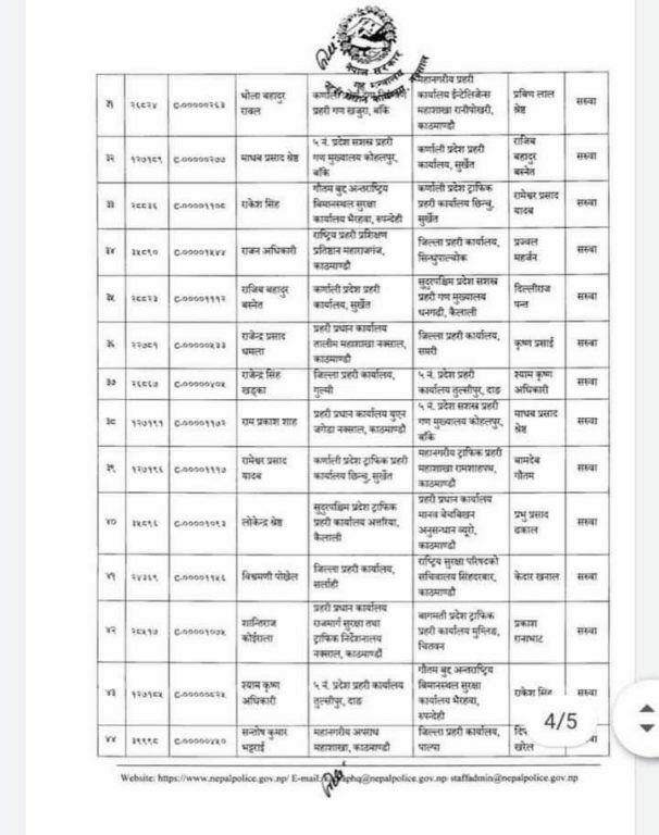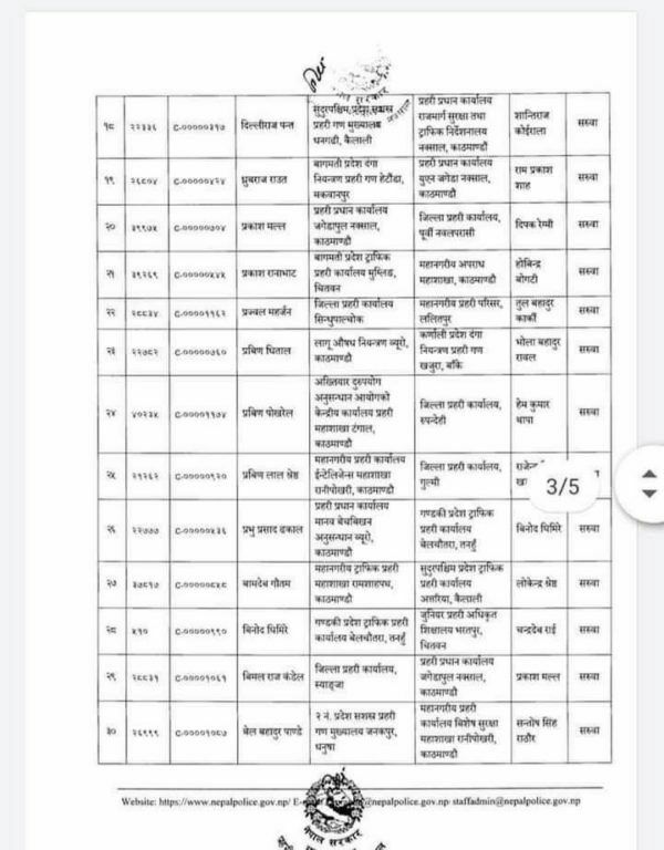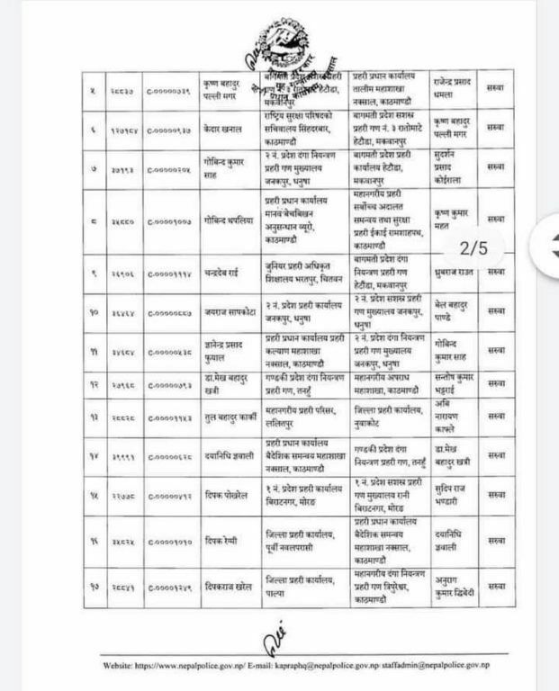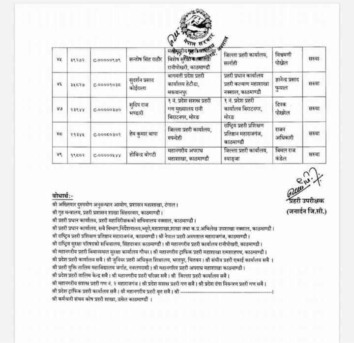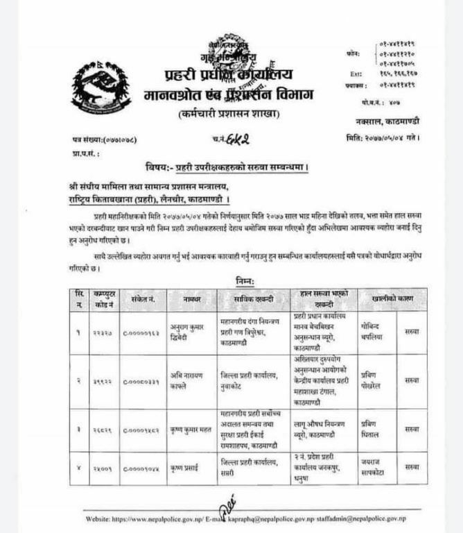 त्यस्तै महानगरीय प्रहरी परिसर ललितपुरमा कार्यरत तुल बहादुर कार्कीको जिल्ला प्रहरी कार्यालय नुवाकोटमा सरुवा भएको छ ।