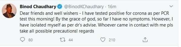 चौधरीले आफूलाई कोरोना पुष्टि भएको र आफू डाक्टरको सल्लाह अनुसार सेल्फ आइसोलेसनमा बसेको सामाजिक सञ्जाल ट्वीटर मार्फत जानकारी दिएका छन् । त्यस्तै आफूमा कोरोनाको कुनै लक्षण नभएको समेत बताएका छन् ।