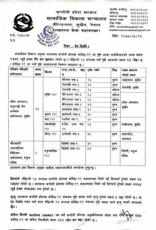 पछिल्लो २४ घण्टामा १३ जना संक्रमित थपिएका छन् । थपिनेहरू सुर्खेतका ७, जुम्लाका १ र रुकुमपश्चिमका २ जना रहेका छन् । त्यस्तै बारा, मकवानपुर र मोरङका १(१ जना रहेका छन् ।