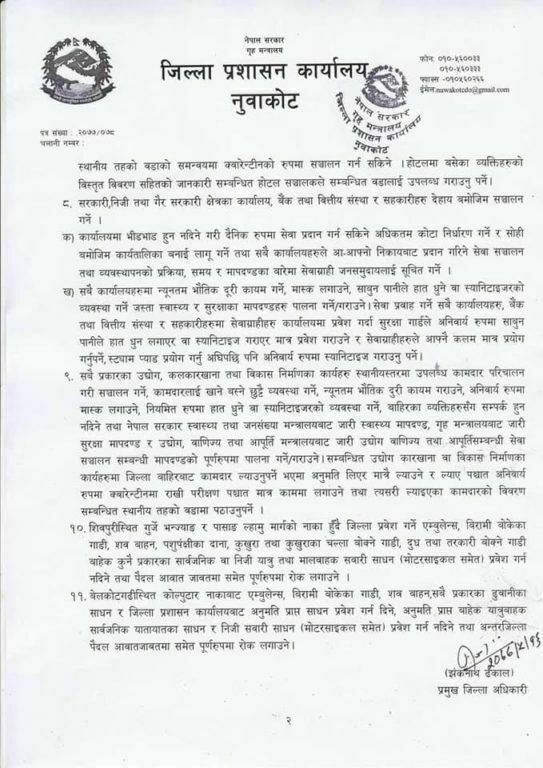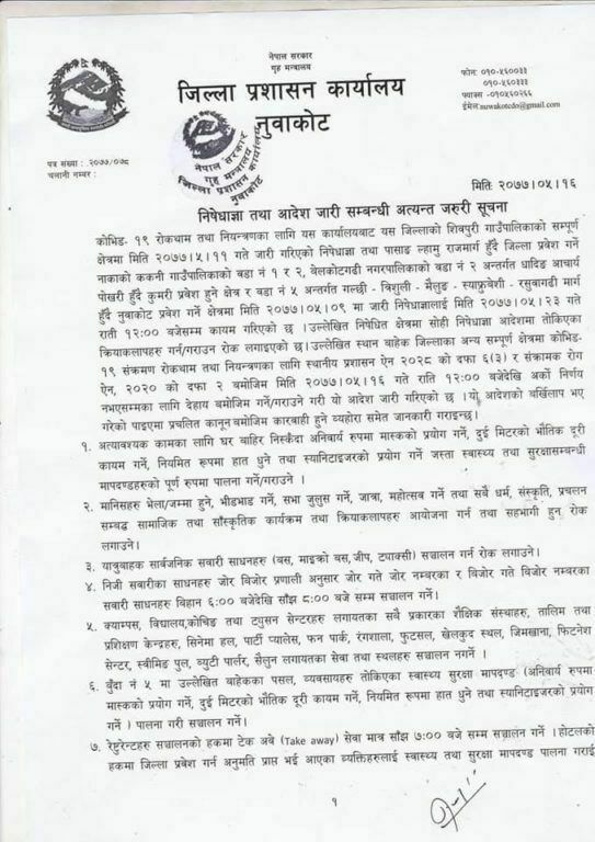 नुवाकोट । जिल्ला प्रशासन कार्यालय नुवाकोटले कोरोना जोखिमलाई मध्येनजर गर्दै पुनः निषेधाज्ञा जारी गर्ने निर्णय गरेको छ ।