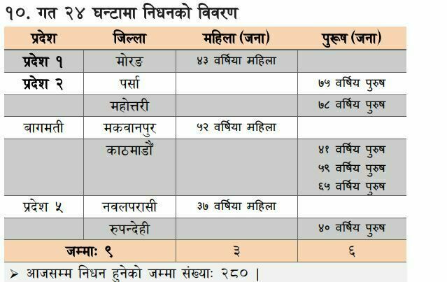 काठमाडौंमा ४१, ५९ र ६५ वर्षिय पुरुषको कोरोनाबाट मृत्यु भएको हो । यस्तै पर्सामा ७५, महोत्तरीमा ७८ र रुपन्देहीमा ४० वर्षिय पुरुषको मृत्यु भएको छ । यसैरी मोरङमा ४३, मकवानपुरमा ५२ र नवलपरासीमा ३७ वर्षिया महिलाको कोरोनाबाट मृत्यु भएको छ । यो सँगै नेपालमा कोरोनाबाट मृत्यु हुनेको संख्या २ सय ८० पुगेको छ ।