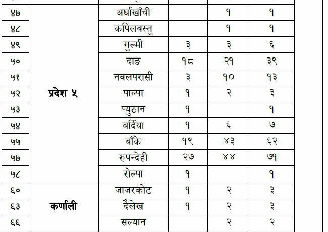 प्रदेश नम्बर १ मा ७ सय ९९, प्रदेश नम्बर २ मा ३ सय २५, बागमती प्रदेशमा ५ हजारु ८ सय ७५ र गण्डकी प्रदेशमा ८ सय ६० जना संक्रमित रहेका छन । यस्तै प्रदेश नम्बर ५ मा ९ सय ५, कर्णाली प्रदेशमा ३ सय ३० र सुदूरपश्चिम प्रदेशमा ७ सय ७२ जना गरी देशभरी ९ हजार ८ सय ६६ संस्थागत आइसोलेसनमा उपचाररत रहेका छन् ।