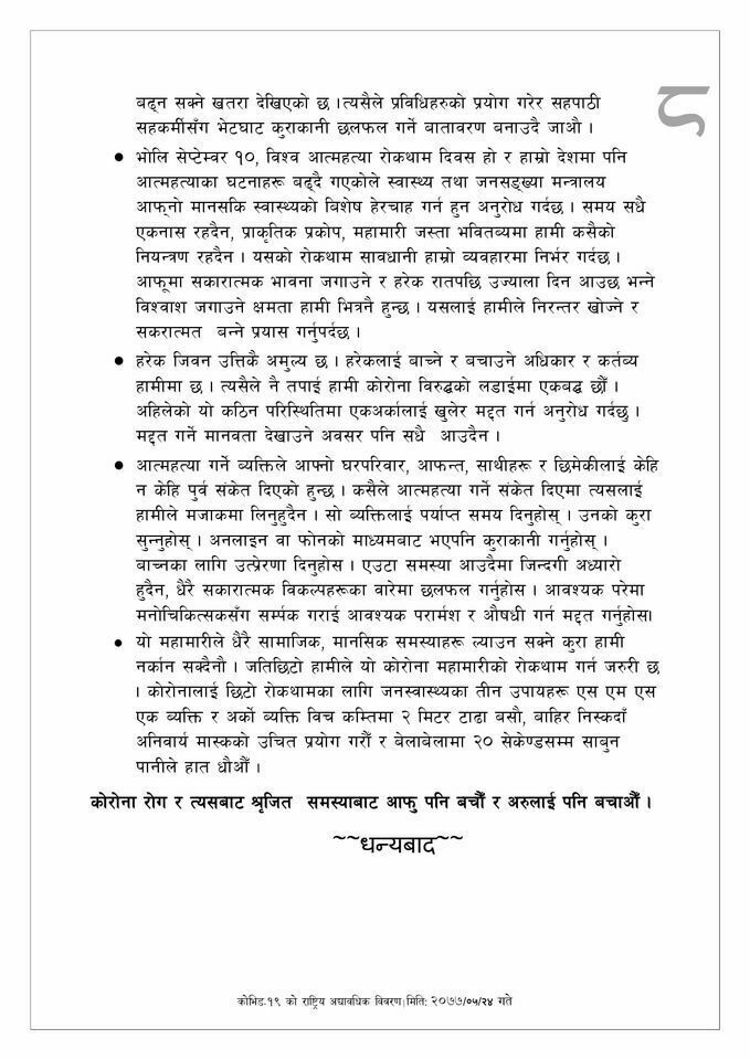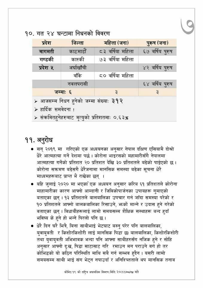 स्वास्थ्य तथा जनसंख्या मन्त्रालयका अनुसार ३ महिला र ३ जना पुरुष र काठमाडौंमा ८३ वर्षिया महिला र ६७ वर्षिय पुरुषको कोरोनाबाट मृत्यु भएको हो । यस्तै कास्कीमा ७३ वर्षिया महिला, अर्घाखाँँचीमा ४२ वर्षिय पुरुष, बाँकेमा ८० वर्षिया महिला र नवलपरासीमा ६४ वर्षिय पुरुषको मृत्यु भएको हो । योसँगै नेपालमा कोरोनाबाट मृत्यु हुनेको संख्या ३ सय १२ पुगेको छ ।