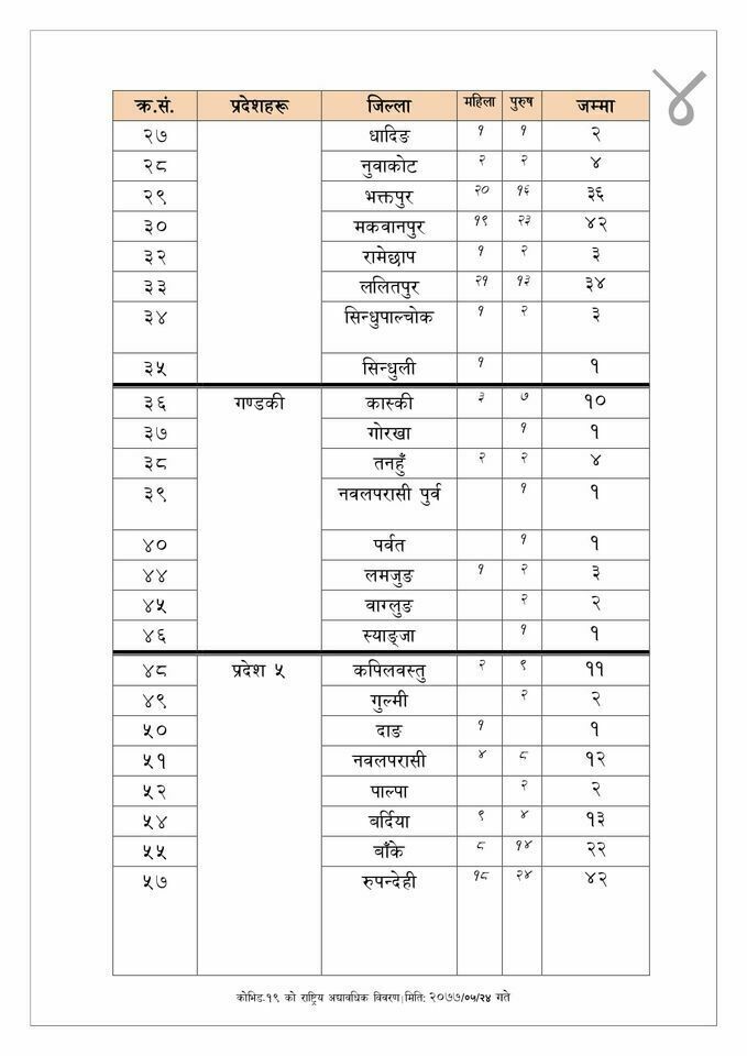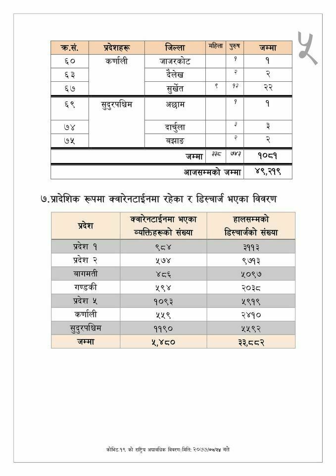 प्रदेश नम्बर १ मा ३ हजार १ सय १३, प्रदेश नम्बर २ मा ९ हजार ७ सय १३, बाग्मती प्रदेशमा ५ हजार ९७ र गण्डकी प्रदेशमा २ हजार ३८ जना, प्रदेश नम्बर ५ मा ५ हजार ९ सय १९, कर्णाली प्रदेशमा २ हजार ४ सय १० र सुदूरपश्चिम प्रदेशमा ५ हजार ५ सय ९२ जना गरी आजसम्म ३३ हजार ८ सय ८२ जना डिस्चार्ज भएका छन् ।