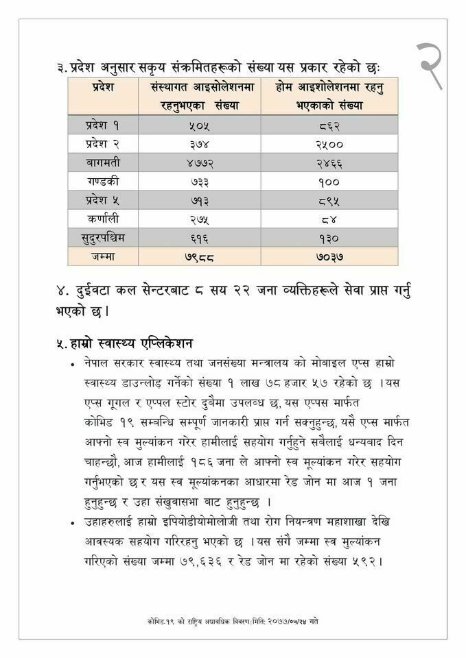 होम आइसोलेसनमा प्रदेश नम्बर १ मा ८ सय ६२, प्रदेश नम्बर २ मा २ हजार ५ सय, बाग्मती प्रदेशमा २ हजार ४ सय ६६ र गण्डकी प्रदेशमा १ सय जना, प्रदेश नम्बर ५ मा ७ सय ९५, कर्णाली प्रदेशमा ८४ र सुदूरपश्चिम प्रदेशमा १ सय ३० जना गरी देशभरी होम आइसोलेसनमा ७ हजार २७ जना संक्रमित उपचाररत रहेका छन् ।