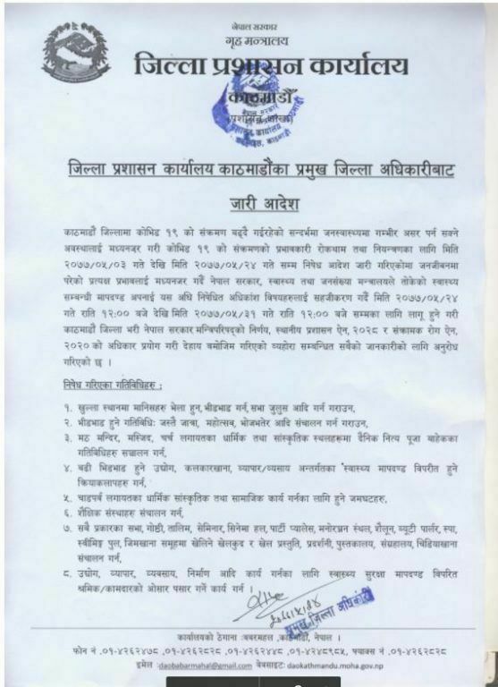 काठमाडौं । काठमाडौं उपत्यकामा जारी निषेधाज्ञा खुकुलो बनाइएको छ । उपत्यकाको तीनै जिल्लाका प्रमुख जिल्ला अधिकारीहरुको आज बसेको बैठकले उक्त निर्णय गरेको हो ।