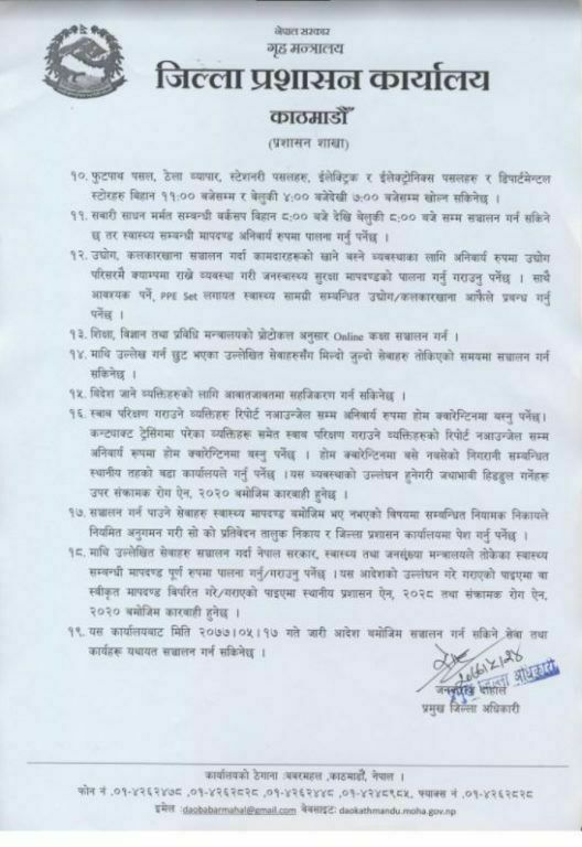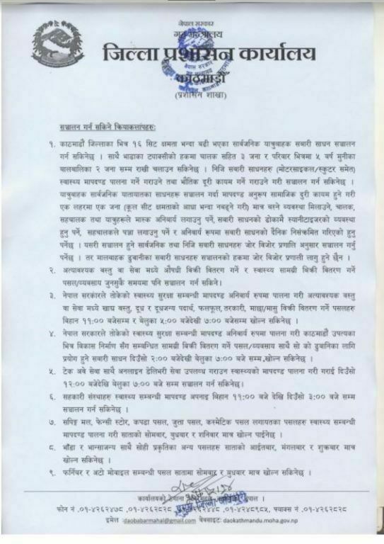 जसअनुसार भोलीबाट उपत्यकामा १६ सिट भन्दा बढी क्षमता भएका सवारी सञ्चालनका लागि भने जोरविजोर प्रणाली लागू हुनेछ । त्यस्तै अत्यावश्यक वस्तु तथा सेवाका लागि भने औषधी बिक्रि वितरणका लागि भने पसलहरु जुनसुकै समयमा पनि सञ्चालन गर्न पाइनेछ । उपत्यका भित्र ढुवानीका साधनहरु भने दिउँसो २ बजेबाट बेलुका ७ बजेसम्म व्यवसाय सञ्चालन गर्न पाइने छ ।