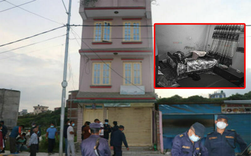 घटना : पहिलो, दोस्रो र तेस्रो तलामा परिवारका तीन सदस्यसहित कुकुरको शव (३६ वर्षीय सुदीप अधिकारी, उनकी ३४ वर्षीया पत्नी सम्झना अधिकारी र १५ वर्षीय छोरा सुशान्त अधिकारी र सेतो रङको कुकुर)