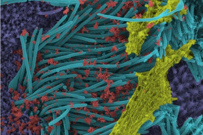 यो हाई पावर माइक्रोस्कोपिक तस्वीर मानव श्वासन तन्त्रको सतहमा ठूलो संख्यामा रहेका भाइरस पार्टिकललाई दर्शाउँछ । जसले अन्य टिश्यूलाई संक्रमित गर्न र अन्य मानिससम्म फैलाउनका लागि तयार भएको छ ।