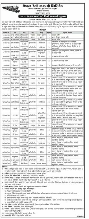 कम्पनीले शाखा अधिकृत, कानुन अधिकृत, स्टेसन मास्टर, सव इन्जिनियर, सहायक स्टेसन मास्टर, प्रमुख प्रशासन सहायक, क्यासियर, टिकट बिक्रेता सहायक, अमिन, रेल गार्ड, फोर म्यानलगायत २९ पदमा करारमा कर्मचारी माग गरेको हो ।