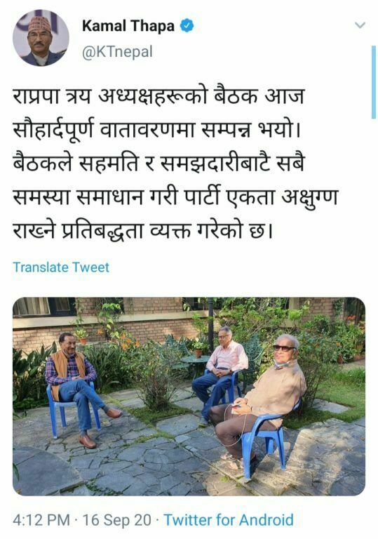 अध्यक्षत्रय कमल थापा, पशुपति शमसेर राणा र प्रकाशचन्द्र लोहनीबीच भएको बैठकले पार्टी एकता अक्षुण राख्ने प्रतिबद्धता गरेको अध्यक्ष थापाले सामाजिक सञ्जालमा बताएका छन् ।