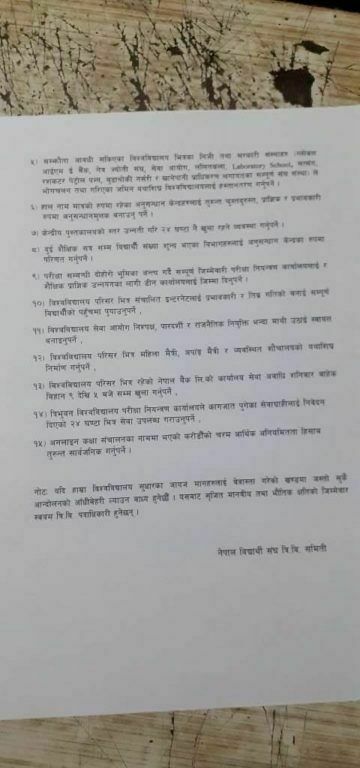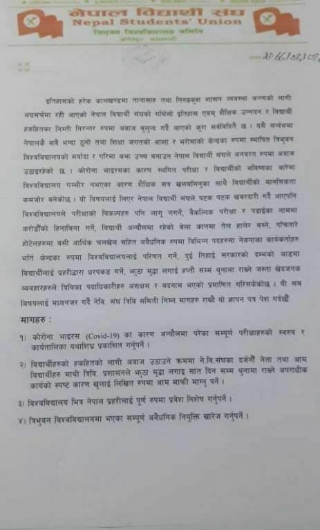 नेविसंघ त्रिभुवन विश्वविद्यालयका अध्यक्ष जगदिश भट्टको टोलीले आज त्रिविका पदाधिकारीलाई १५ बुँदे ज्ञापनपत्र बुझाँउदै रोकिएका सम्पूर्ण परीक्षाको स्वरुप र कार्यतालिका सार्वजनिक गर्न समेत आग्रह गरेका हुन् ।
