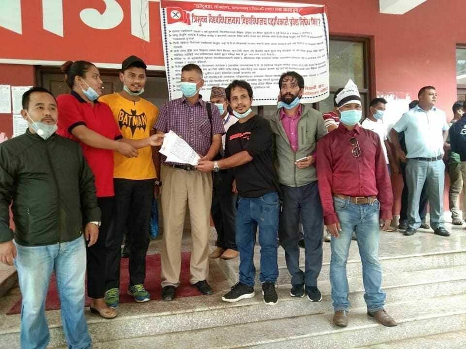 नेविसंघ त्रिभुवन विश्वविद्यालयका अध्यक्ष जगदिश भट्टको टोलीले आज त्रिविका पदाधिकारीलाई १५ बुँदे ज्ञापनपत्र बुझाँउदै रोकिएका सम्पूर्ण परीक्षाको स्वरुप र कार्यतालिका सार्वजनिक गर्न समेत आग्रह गरेका हुन् ।