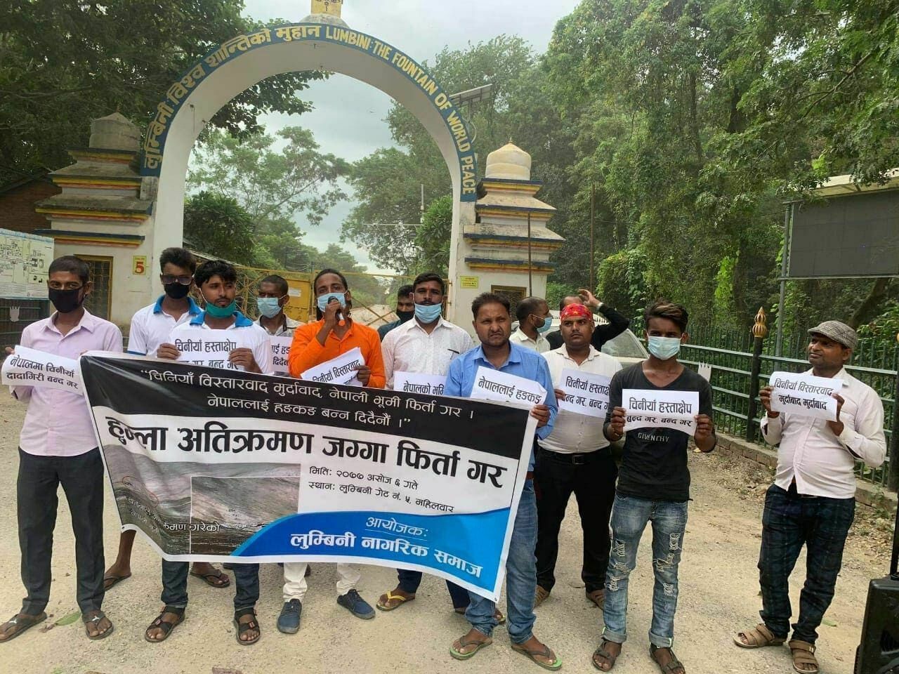 काठमाडौं । नेपाली भूमी अतिक्रमण गरी चीनले भवन निर्माण गरेको पाइएपछि लुम्बिनी नागरिक समाजले आपत्ति जनाएको छ। समाजले चिनियाँ हस्तक्षेपको खेदो खन्दै नेपालमा चीनको दादागिरी चल्दैन भन्दै चीनविरूद्द नारा लगाएको छ।