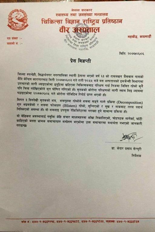 शवलाई उपयुक्त रेफ्रिजेरेटरमा नराख्दा सड्न गल्न सक्ने भन्दै गलत प्रचारबाजी नगर्न अस्पतालका निर्देशक डा केदार सेन्चुरीले विज्ञप्ति जारी गर्दै आग्रह गरेका छन् ।