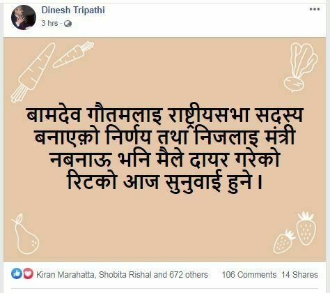 त्रिपाठीले सर्वोच्चमा दर्ताका लागि पेस गरेको निवेदनमा तत्काल राष्ट्रियसभा सदस्यका रूपमा काम नगर्न, नगराउन अन्तरिम आदेश माग गरिएको छ ।