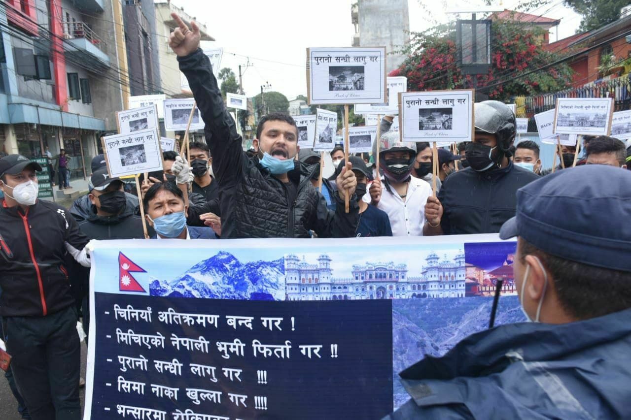 ‘सीमा अतिक्रमण बन्द गर्नुपर्ने’, ‘मिचिएको भूमि फिर्ता गर्नुपर्ने’, ‘पुरानो सन्धि लागू हुनपर्ने’ माग गर्दै प्रदर्शनमा उत्रिएकाहरुले दूताबास अगाडी नाराबाजी गरेका छन् । दूताबास अघि पुगेका युवाहरुको समूहले ब्याक अफ चाइना लेखिएका पम्पलेटसमेत प्रदर्शन गरेका छन् ।