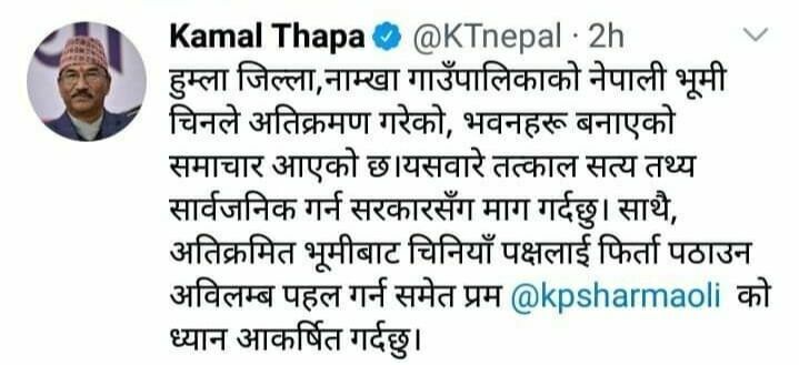 सामाजिक सञ्जाल ट्वीटरमार्फत अध्यक्ष थापाले हुम्लाको नाम्खा गाउँपालिकास्थित नेपाली भूमिमा चीनले अतिक्रमण गरेर भवनहरू बनाएकोप्रति चासो राखेका हुन् ।