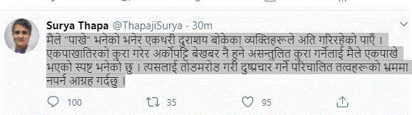 सामाजिक सञ्जाल ट्वीटरमा एक ट्वीट गर्दै उनले आफूले जनताले सोचेजस्तो हिसाबले किसीमको पाखे नभनेको भन्दै प्रष्टिकरण दिएका हुन् । उनले लेखेका छन्, ‘मैले “पाखे” भनेकाे भनेर एकथरी दुराशय बाेकेका व्यक्तिहरूले अति गरिरहेकाे पाएँ । एकपाखातिरकाे कुरा गरेर अर्काेपट्टि बेखबर नै हुने असन्तुलित कुरा गर्नेलाई मैले एकपाखे भएकाे स्पष्ट भनेकाे छु । त्यसलाई ताेडमराेड गरी दुष्प्रचार गर्ने परिचालित तत्वहरूकाे भ्रममा नपर्न आग्रह गर्दछु ।’