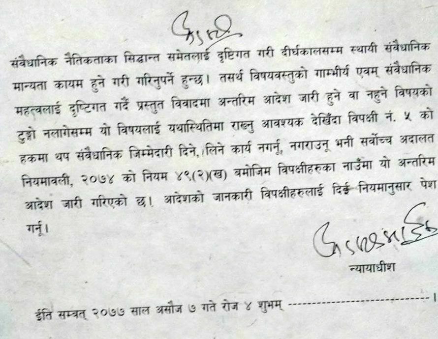 आदेशमा भनिएको छ–विषयवस्तुको गाम्भीर्य एवम् संवैधानिक महत्वलाई दृष्टिगत गर्दै प्रस्तुत विवादमा अन्तरिम आदेश जारी हुने वा नहुने विषयको टुङ्गो नलागेसम्म यो विषयलाई यथास्थितिमा राख्नु आवश्यक देखिँदा गौतमको हकमा थप संवैधानिक जिम्मेवारी दिने, लिने कार्य नगर्नू, नगराउनू । सर्वोच्च अदालत नियमावली, २०७४ को नियम ४९ (२) ख बमोजिम विपक्षीहरुका नाममा यो अन्तरिम आदेश जारी गरिएको छ ।’