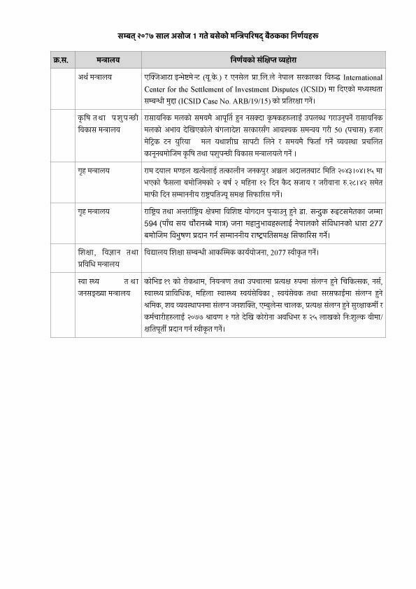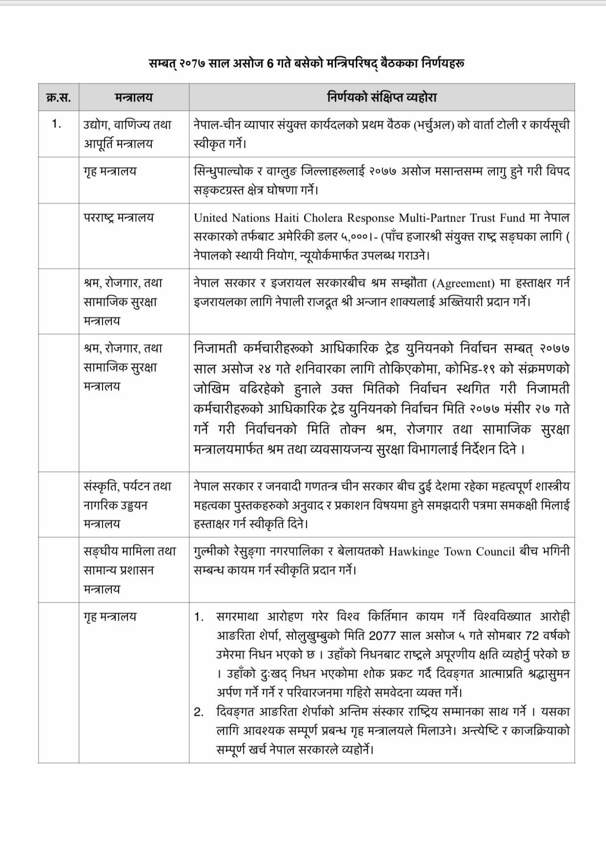 काठमाडौं । मन्त्रिपरिषद्को २ बैठकका निर्णय बुधबार सार्वजनिक गरिएको छ । बुधबार सरकारका प्रवक्ता तथा परराष्ट्रमन्त्री प्रदीप कुमार ज्ञवालीले असोज १ र ६ गते बसेको बैठकका निर्णयहरु सार्वजनिक गरेका हुन् ।