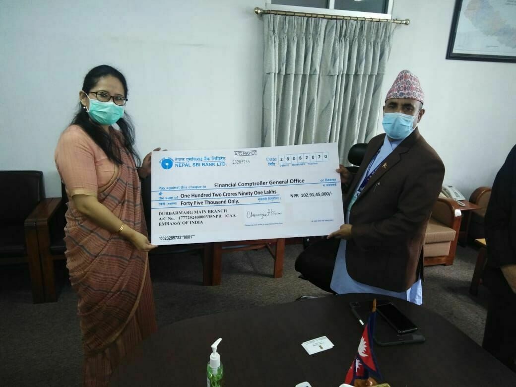 बिहीवार भारतीय भारतीय राजदूतावासकी नियोग उप–प्रमुख नामग्य खम्पाद्वारा नेपाल सरकार अर्थ मन्त्रालयका सचिव शिशिर कुमार ढुङ्गानालाई १ अर्ब ५४ करोड रुपैयाँ बराबरको चेक हस्तान्तरण गरेकी हुन् ।