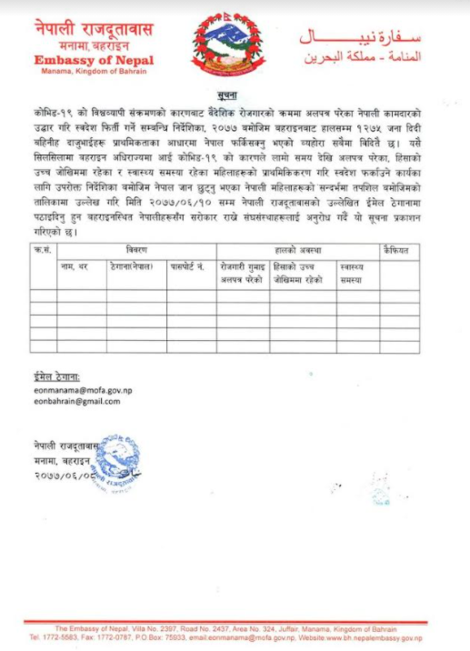 बहराइनस्थित नेपाली दूतावासले स्वदेश फर्किनेहरुको विवरण पुन: संकलन गर्दै