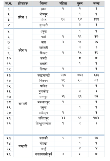 काठमाडौंमा ६३३, ललितपुरमा १०४ र भक्तपुरमा ७२ जनासहित देशभर ५२४ महिला र १ हजार ४९ जना पुरुष संक्रमित थपिएका छन् ।