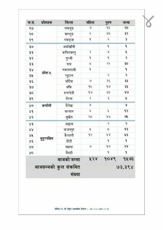 यस्तै काठमाडौंसहित, मोरङ, रुपन्देही, सिरहा, ललितपुर, भक्तपुर,चितवन गरि ७ वटा जिल्लामा ५ सय बढी हालको अवस्थामा उपचाररत संक्रमित रहेको स्वास्थ्य मन्त्रालयका प्रवक्ता प्राध्यापक डाक्टर जागेश्वर गौतमले बताएका छन् ।