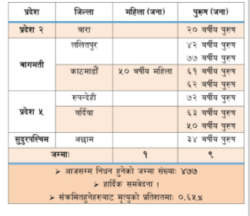 स्वास्थ्य तथा जनसंख्या मन्त्रालयका अनुसार १ महिला र ९ जना पुरुषको कोरोनाबाट मृत्यु भएको हो । काठमाडौं उपत्यकामा एक महिला सहित ५ जनाको मृत्यु भएको छ ।