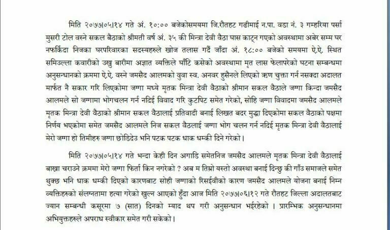 उनी घाँस काट्न गएकी मिन्त्रा देवी अबेससम्म पनि नफर्किएपछि परिवारका सदस्यहरुले खोजि गर्दा समिउल्ला कवारीको उखु बारीमा उनको शव भेटिएको थियो ।