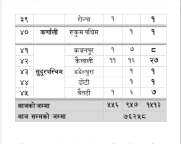 आज ७ सय ३१ जना डिस्चार्ज भएका छन । आजसम्म प्रदेश नम्बर १ मा ५ हजार ७०, प्रदेश नम्बर २ मा १३ हजार ५ सय ६३, बागमती प्रदेशमा १५ हजार ३ सय ११ र कर्णाली प्रदेशमा ३ हजार २ सय ९३ जना डिस्चार्ज भएका छन । यस्तै प्रदेश नम्बर ५ मा ८ हजार ५ सय ७१ कर्णाली प्रदेशमा २ हजार ८ सय ६५ र सुदूरपश्चिम प्रदेशमा ६ हजार ६ सुय ८९ जना गरी ५५ हजर ३ सय ७१ जना डिस्चार्ज भएका छन ।