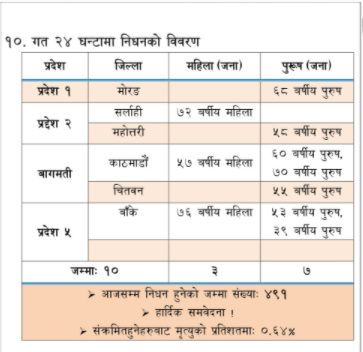 स्वास्थ्य तथा जनसंख्या मन्त्रालयका अनुसार ३ महिला र ७ जना पुरुषको कोरोनाबाट मृत्यु भएको हो । काठमाडौंका एक महिला सहित ३ र बाँकेमा एक महिला सहित ३ जनाको मृत्यु भएको छ । काठमाडौंमा ५७ वर्षिया महिला, ६० र ७० वर्षिय पुरुष रहेका छन । भने बाँकेमा ७६ वर्षिया बृद्धा, ५३ र ३९ वर्षिय पुरुष रहेका छन । यस्तै मोरङमा ६८ वर्षिय पुरुष, सर्लाहीमा ७२ वर्षिया महिला, महोत्तरीमा ५८ वर्षिय पुरुष र चितवनमा ५५ वर्षिय पुरुषको कोरोनाबाट मृत्यु भएको छ । यो सँगै नेपालमा कोरोनाबाट मृत्यु हुनेको संख्या ४ सय ९१ पुगेको छ ।