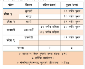 यससँगै नेपालमा कोरोनाको कारण मृत्यु हुनेको संख्या ४९८ पुगेको छ । यो कुल संक्रमितको ० दशमलव ६५ प्रतिशत हो । आज मृत्यु हुनेमा २ जना महिला र ५ जना पुरुषहरु रहेका छन् ।
