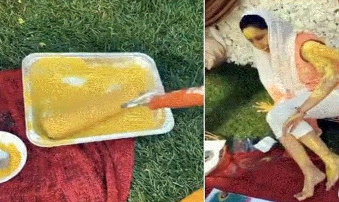 भिडियोमा एक दुलहीलाई रोलर ब्रशको माध्यमबाट हल्दी लगाइएको छ । मानिसहरुले यो तरिका एकदमै मन पराईरहेका छन् ।