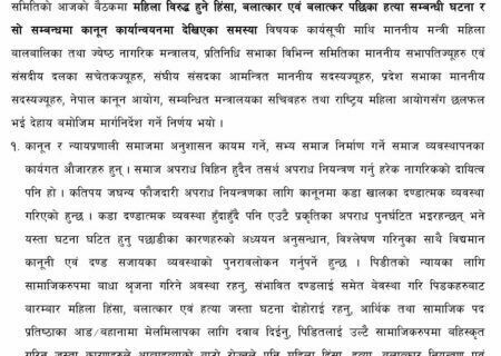 बुधबार बसेको समिति बैठकले बलात्कारका घटनामा संलग्नलाई मृत्यु दण्ड दिन सम्भव हुने वा नहुने बारे अध्ययन गर्न सरकार र कानून आयोगलाई निर्देशन दिएको हो ।
