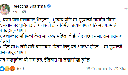 गृहमन्त्री थापाले हिजो (बुधवार) विश्वका सवा २ सय देशको अवस्था हेर्दा बलात्कारको बिषयमा नेपालले चिन्ता गर्नुपर्ने ठाउँ नरहेको बताएपछि उनले सामाजिक सञ्जाल फेसबुकमा यस्तो आक्रोश व्यक्त गरेकी हुन् ।