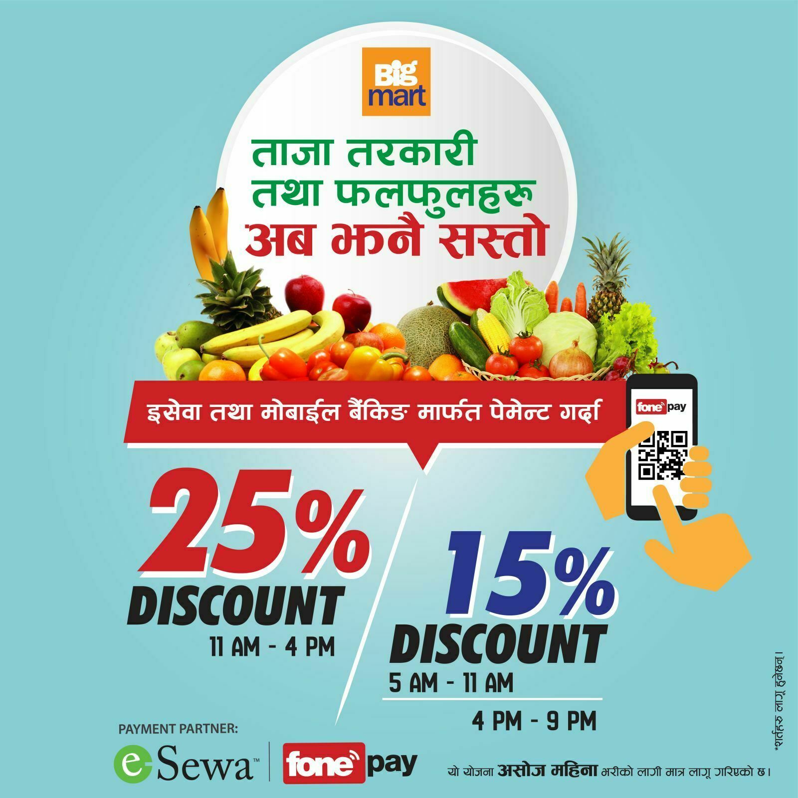 यो योजना बिगमार्टका ५० वटै स्टोर्समा लागू छ । योजना अनुसार बिहान र बेलुका फलफुल तथा तरकारी खरिद गर्दा इसेवा तथा फोनपेबाट (मोबाईल बैंकिङ) क्यूआर मार्फत भुक्तानी गर्दा १५ प्रतिशत छुट पाइने छ भने दिउसो ११ बजेदेखि ४ बजेसम्म २५ प्रतिशत छुट पाइने छ । यस्तो छुट अधिकतम रू ३ सय सम्म पाइनेछ ।