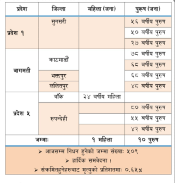 आज थप ११ जना मृतक थपिएसँगै नेपालमा कुल मृतकको संख्या ५ सय ९ पुगेको छ । स्वास्थ्य तथा जनसंख्या मन्त्रालयका अनुसार आज १० पुरुष र एक महिला गरी ११ जनाको मृत्यु भएको छ । मन्त्रालयका अनुसार बाँकेमा ३४ वर्षिया महिलाको कोरोनाबाट मृत्यु भएको छ । यस्तै काठमाडौं उपत्यकामा चारजना संक्रमितको मृत्यु भएको छ । काठमाडौंमा ७८ र ६८ वर्षिय पुरुष, भक्तपुरमा ४८ वर्षिय र ललितपुरमा ४८ वर्षिय पुरुषको मृत्यु भएको छ । यस्तै सुनसरी र रुपन्देहीमा तीन र तीन जनाको मृत्यु भएको छ । सुनसरीमा ५६, ५० र २७ वर्षिय पुरुषको मृत्यु भएको छ । रुपन्देहीमा ८०, ५५ र ४२ वर्षिय पुरुषको मृत्यु भएको मन्त्रालयले जनाएको छ ।