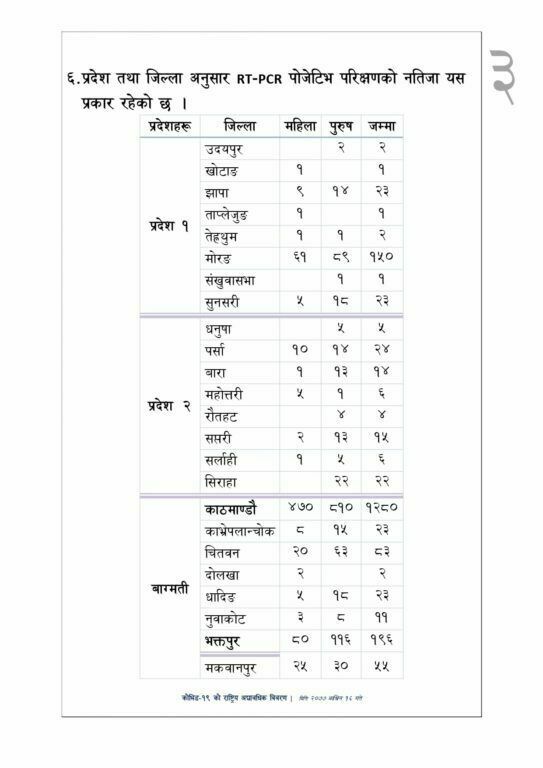 स्वास्थ्य तथा जनसंख्या मन्त्रालयका अनुसार आज काठमाडौं उपत्यकामा १६ सय ३८ गरी देशभरी २७ सय २२ जनामा संक्रमण देखिएको छ । १४ हजार ७ सय ३९ पीसीआर परीक्षण भएकोमा ९ सय ६५ महिला र १७ सय ५७ जना पुरुषमा संक्रमण देखिएको मन्त्रालयका प्रवक्ता डा. जागेश्वर गौतमले बताए । आज काठमाडौंमा १२ सय ८०, भक्तपुरमा १ सय ९६ र ललितपुरमा १ सय ६२ जनामा संक्रमण देखिएको छ ।
